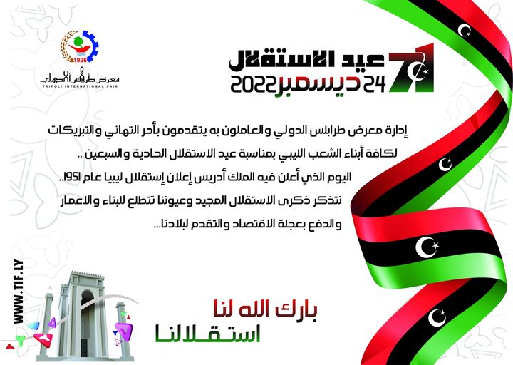 إدارة معرض طرابلس الدولي والعاملون به يتقدمون بأحر التهاني والتبريكات لكافة أبناء الشعب الليبي بمناسبة عيد الاستقلال الحادية والسبعين ..اليوم الذي أعلن فيه الملك أدريس إعلان إستقلال ليبيا عام 1951.. نتذكر ذكرى الاستقلال المجيد وعيوننا تتطلع للبناء والاعمار والدفع بعجلة الاقتصاد والتقدم لبلادنا..