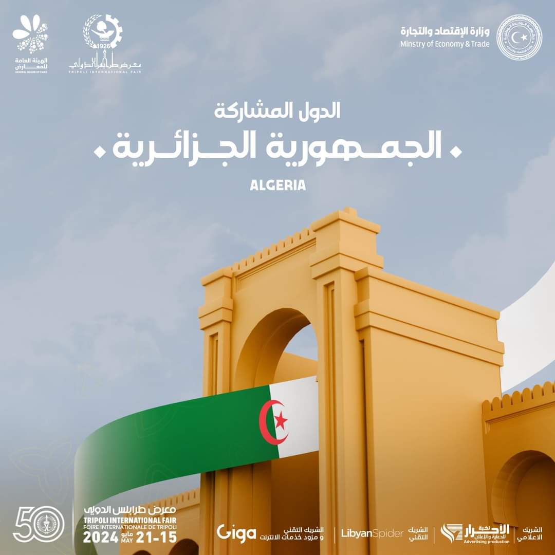 تم تأكيد مشاركة الجزائر في الدورة 50 لمعرض طرابلس الدولي( الدورة الذهبية) بمجموعة من الشركات والمؤسسات الإقتصادية . وتعتبر مشاركة الجزائر في الدورة الخمسين من ضمن الزخم الكبير الذي ستشهده الدورة ودعماً للعلاقات بين البلدين وعودة العالم لدورات معرض طرابلس الدولي.