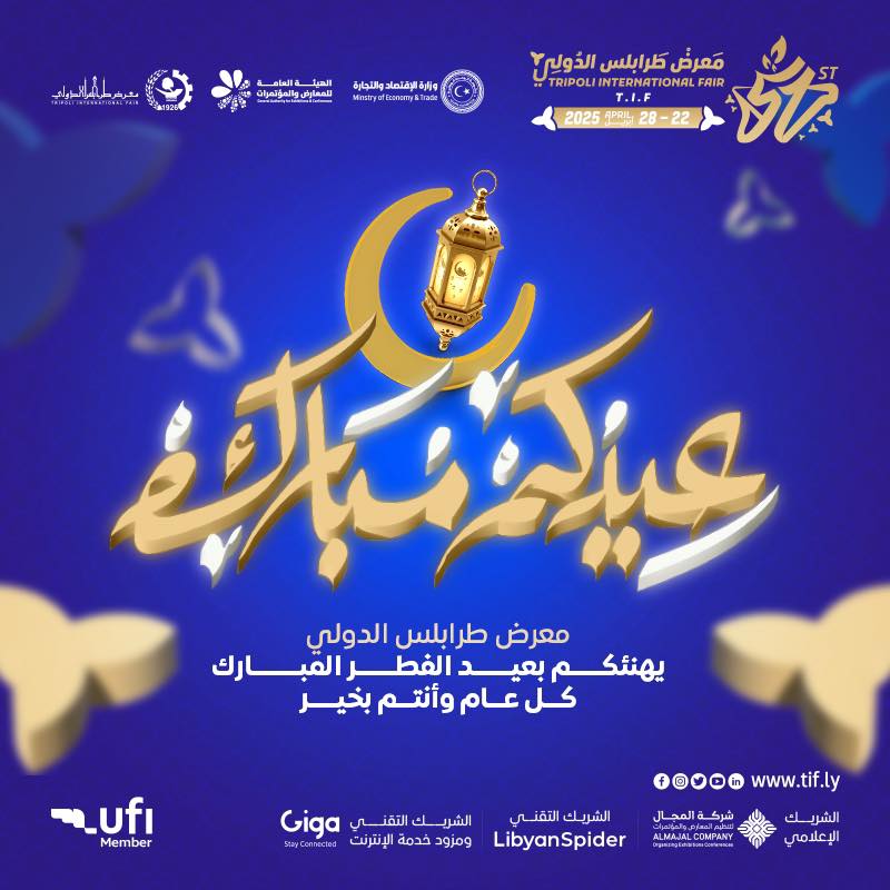 عيد فطر سعيد 🌙✨ بمناسبة حلول عيد الفطر المبارك، يسرّ م. اسلام جعفر مدير عام معرض طرابلس الدولي و العاملين به أن يتقدّموا إليكم بأحرّ التهاني وأطيب الأمنيات. سائلين الله أن يعيده عليكم بالخير واليمن والبركات، وأن يكون عيدًا مليئًا بالفرح والسعادة لكم ولأحبابكم. كل عام وأنتم بخير، ونتطلّع إلى لقائكم في فعاليات الدورة 51 لمعرض طرابلس الدولي ⏳ #الهيئة_العامة_للمعارض_والمؤتمرات #معرض_طرابلس_الدولي #الدورة_الـ51 عرض أقل