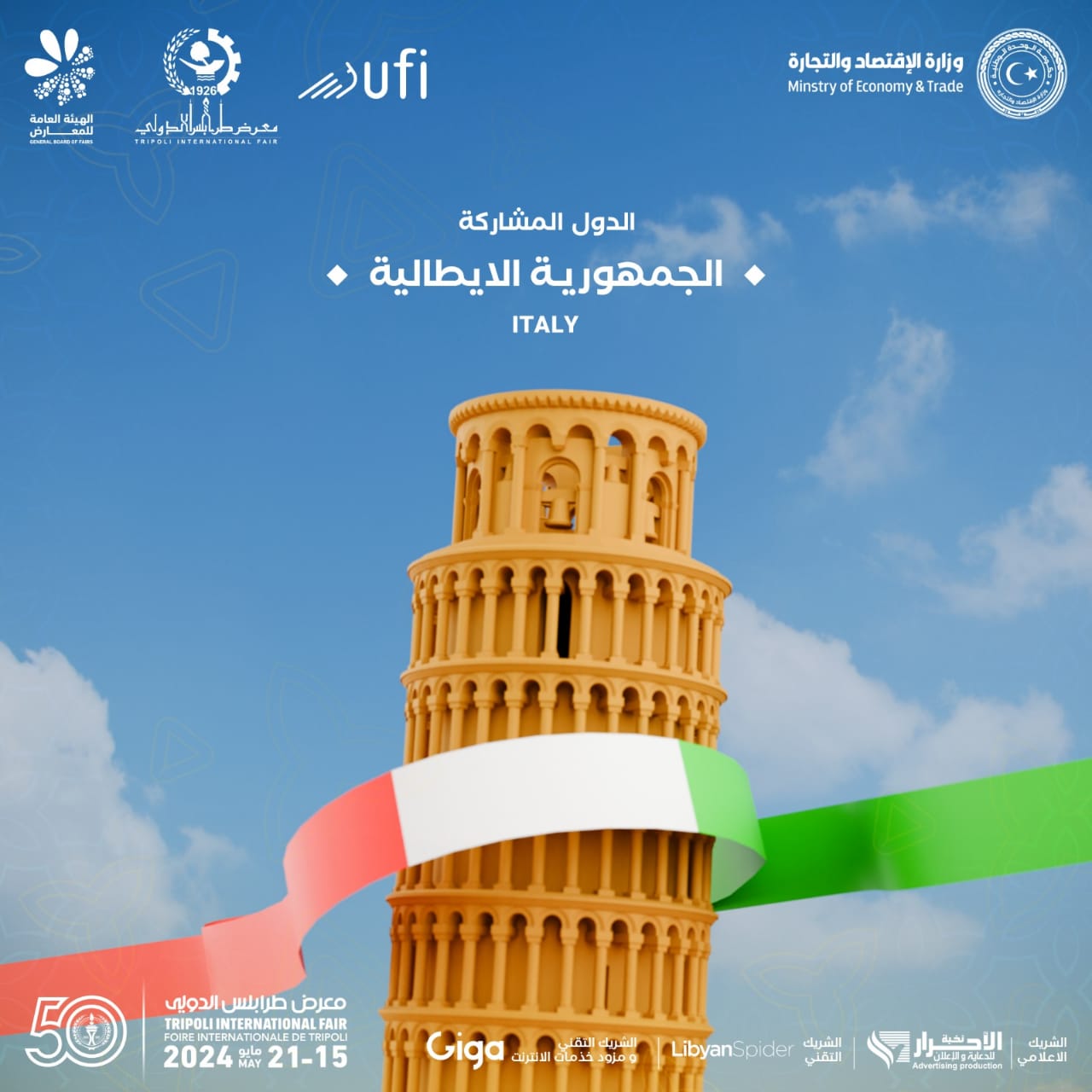 من بين أهم المشاركين في الدورة الخمسين لمعرض طرابلس الدولي الجمهورية الايطالية(Repubblica Italiana)..إيطاليا بتنوعها الإقتصادي وشراكتها معنا على ضفاف المتوسط سيكون حضورها مهما بالنظر لقرب المسافة وجودة الصناعة والتاريخ الممتزج بالتجارب وكون معرض طرابلس تأسس في حقبة وجود الطليان في ليبيا..عاصمة البلاد هي (روما) اللغة (الايطالية) تسمية السكان (إيطاليون-طليان) . عدد السكان وفق إحصاء عام 2022 بلغ 58,853,,482 نسمه..تأسست في 18-يونيو 1946م.عملة البلاد اليورو..تصنف في المرتبة 18 على مستوى العالم من حيث الدول الأكثر تقدماً..