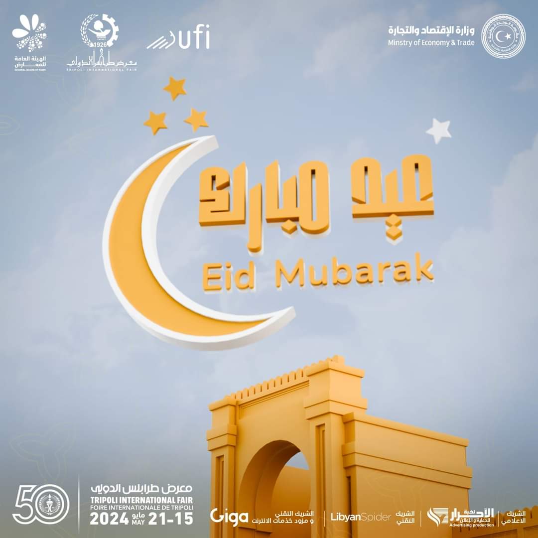 إدارة معرض طرابلس الدولي وكافة العاملين به يتقدمون بأحر التهاني والتبريكات لكافة الليبيين وشعوب العالم الأسلامي بمناسبة حلول عيد الفطر المبارك .. داعين المولى عز وجل أن يعيده علينا وعلى المسلمين باليمن والخير والبركات والإستقرار والنماء.. كل عام وأنتم بالف خير..