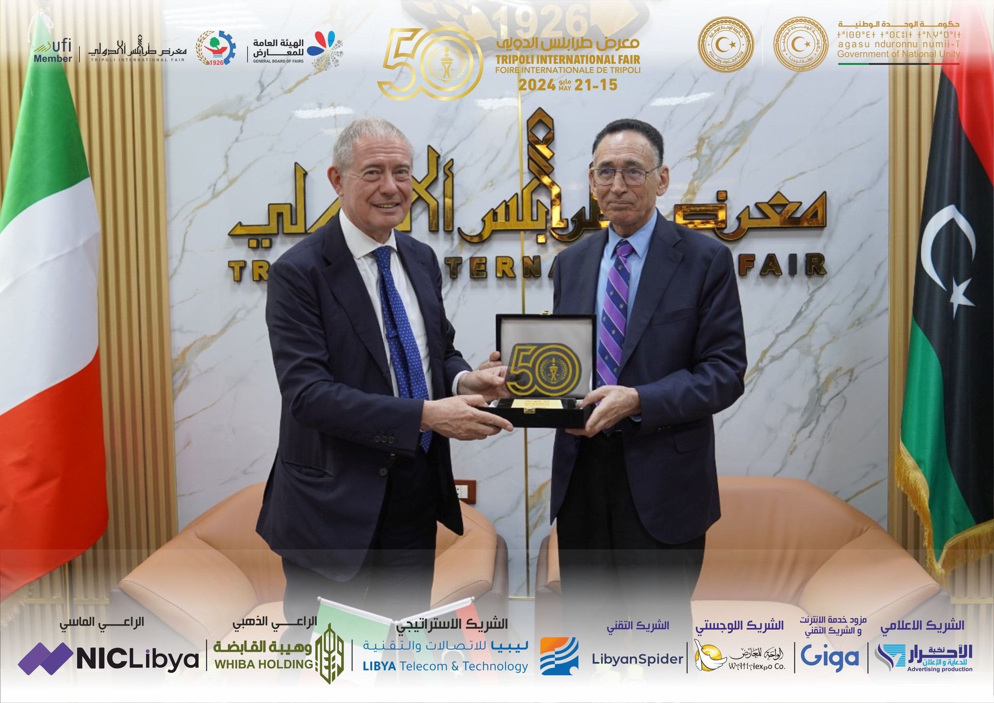 إلتقى معالي وزير الاقتصاد والتجارة السيد / محمد الحويج مع معالي وزير الشركات والصنع في إيطاليا السيد / أدولفو أورسو يوم الثلاثاء 21 مايو 2024م على أرض مدينة المعارض بطرابلس بحضور وكيل الوزراة لشؤون الاقتصادية الدكتور سعد الحنيش و رئيس مجلس إدارة الغرفة التجارية الليبية الإيطالية السيد / أنور بوستة ومدير عام معرض طرابلس الدولي السيد /إسلام جعفر و نائب المدير العام لمعرض طرابلس الدولي السيد / شكري آلطيف وسفير جمهورية إيطاليا لدى دولة ليبيا السيد / جانلوكا البيريني على هامش معرض طرابلس الدولي بدورته الخمسين حيث استعرض اللقاء الملفات ذات الاهتمام المشترك لتعزيز التعاون بين البلدين في قطاعات التجارة والاستثمار كما ناقش الجانبان إمكانية تفعيل الاتفاقيات ومذكرات التفاهم المبرمة بين البلدين منوهً السيد الوزير على أهمية عودة الشركات الكبرى للعمل بدولة ليبيا وأن وزارة الاقتصاد والتجارة تقدم التسهيلات اللازمة لحلحة أي صعوبات تواجها