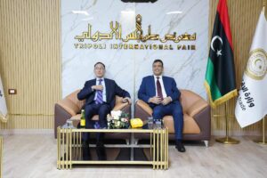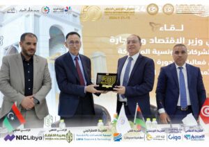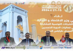بحث وزير الاقتصاد والتجارة السيد / محمد الحويج سير الحركة التجارية البينية مع جمهوريتي مصر وتونس، وذلك خلال لقائه أصحاب الشركات التونسية والمصرية المشاركون بمعرض طرابلس الدولي في دورته 50 بحضور مدير عام معرض طرابلس الدولي السيد/ إسلام جعفر و نائب مدير عام معرض طرابلس الدولي السيد / شكري آلطيف و مدير إدارة التجارة الداخلية بالوزارة ورئيس الاتحاد العام لغرف التجارة والصناعة والزراعة و سفير جمهورية تونس و رئيس الوفد التجاري المصري.